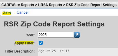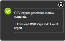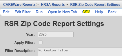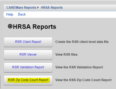 The RSR Zip Code Count Report produces a count of clients by zip code in a CSV format required for uploading that data to the EHB.