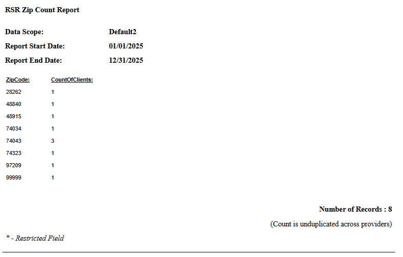 Note: In the results, if the ZipCode is blank next to a count of clients, then the zip code is missing in Demographics for those clients. Update the Demographics and run the report again.