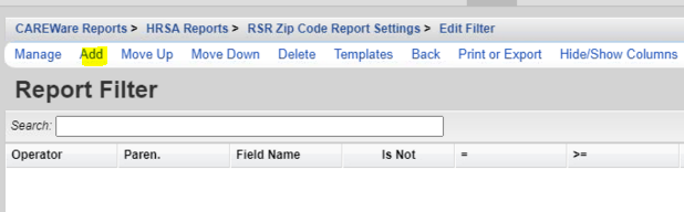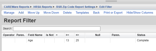 The RSR Zip Code Count Report can be filtered to get data on specific groups of clients. If a provider needs to know how many clients are of a certain age group and live in a specific zip code, the report could be filtered by an age group.