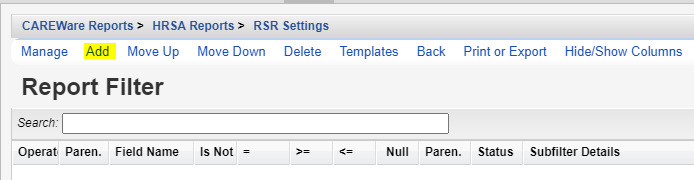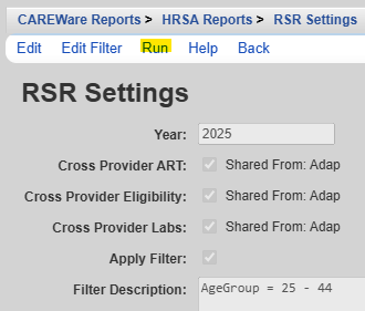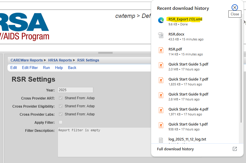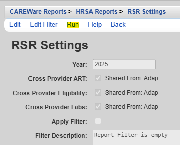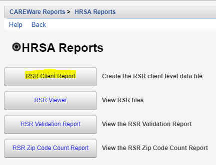 The RSR Client Report generates the file required to be uploaded to HRSA through the EHB each year that the RSR is due. The report generates an XML file, which excludes PII data of clients and uses the eUCI as the client identifier. The generated report includes all current calculations set by HRSA for the RSR of the reporting year selected when the report is run as long as CAREWare has been upgraded to the latest version recommended by HRSA for the RSR export.