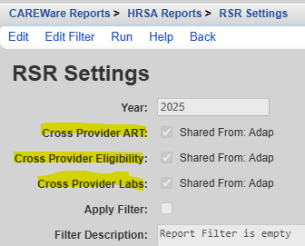 Cross-Provider data or shared data is automatically included in the RSR if providers have enabled data sharing. In the RSR Settings, the Cross-Provider checkbox is checked if any provider has data sharing enabled for that type of data and with the provider running the RSR. The provider sharing the data is listed to the right of the setting. Here are instructions for enabling or disabling shared data.