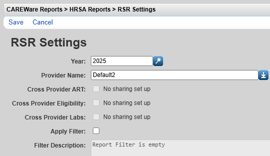 Note: If the RSR Client Report is being run in Central Administration, the provider needs to be selected when saving the settings prior to running the report.