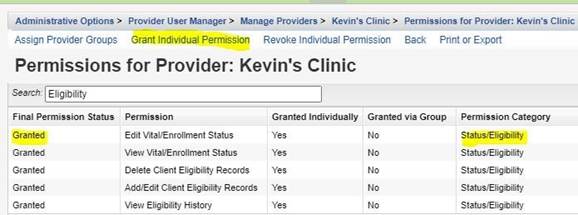 Users need specific permissions in the provider domain of CAREWare to view and/or manage eligibility records. Permissions must also be granted to the provider domain. User permissions can be granted on an individual basis or via user groups.