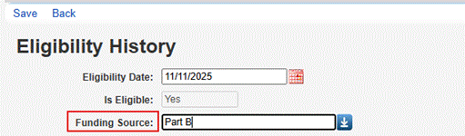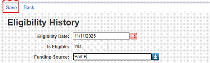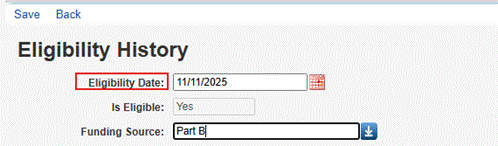 Clients may be eligible for multiple funding sources, and this requires separate eligibility records for each applicable funding source. For instance, a client may be eligible for Part A services on 2/1/2021 and Part C services on 3/1/2021. A separate eligibility record is created for each funding source and date.