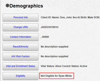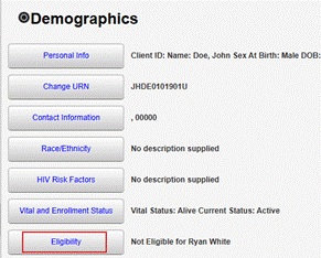 Once the Eligibility is updated with Yes for Is Eligible and a RW or RW-Related funding source is selected, the client’s Eligibility Status changes to Ryan White Eligible.