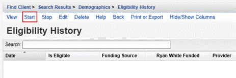 Eligibility Status includes the history of a client’s eligibility for Ryan White-funded services. Eligibility records determine if the client is included in the RSR.