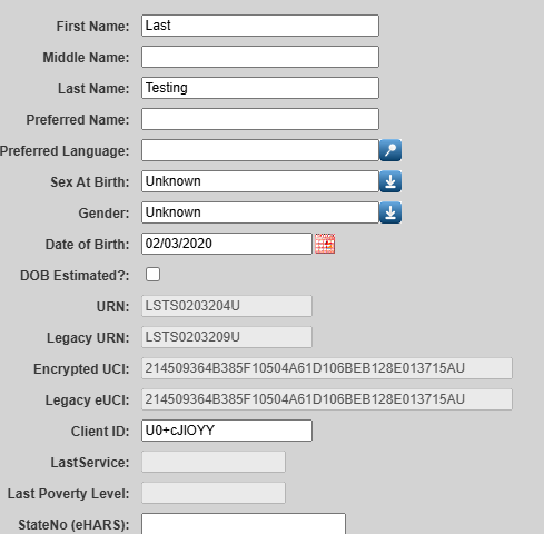 A service record is imported for a client and the exp_service table has the client’s name and DOB, however sex at birth is left blank. CAREWare generates a URN with the sex at birth value as a 4 and creates an eUCI encrypting that value. So you can see the client has a URN of LSTS0103204U. A 4 was inserted where the missing sex at birth would be. The Legacy URN reflects what the URN would have been in the old system, where the client’s gender is missing a 9 was inserted for that missing value.