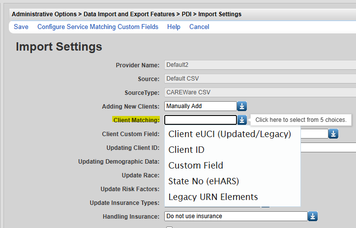Due to the changes to calculating the eUCI for the 2025 RSR, CAREWare has an eUCI (the new calculation for the 2025 RSR), and a Legacy eUCI (The old calculation for the 2024 RSR or earlier). Users can select a single setting (Client eUCI (Updated/Legacy) for matching clients to use both the new and the old eUCI.CAREWare determines which eUCI to use by either matching the exact value from the new eUCI or the old eUCI to value in the match ID column or by using the URN fields from that imported file appropriate for calculating that version of the eUCI.