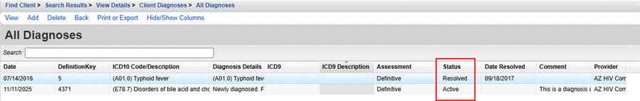 Users can review a more limited list of only active diagnoses for a client. The list of diagnoses under All Diagnoses shows active, inactive, and resolved diagnoses.