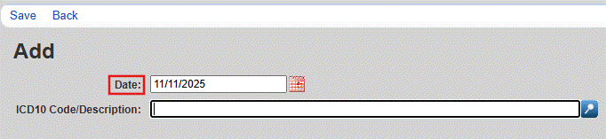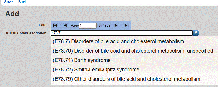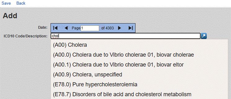 5. Search for the diagnosis in the ICD10 Code/Description box. Diagnoses can be located with the name of the diagnosis or the ICD-10 code.