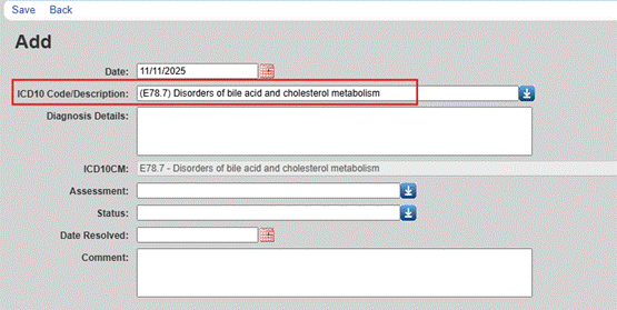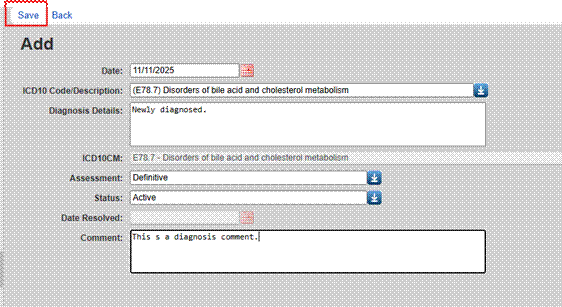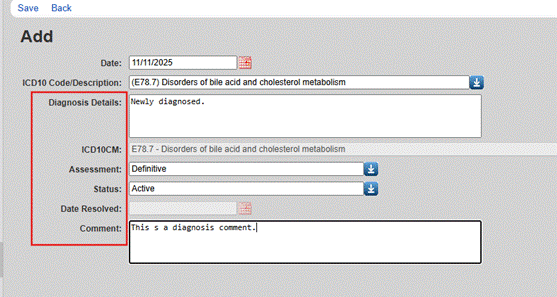 7. Complete the fields for Diagnosis Details, Assessment (Definitive, Presumptive, or Unknown), Status (Active, Inactive, or Resolved), Date Resolved, and Comment.