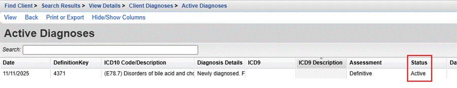 Print or Export: Print or export the list of active diagnoses for the client.