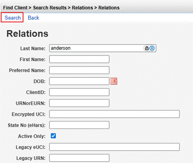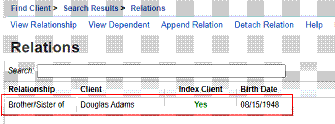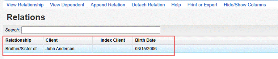 The Relations list shows the relationship, as well as the appended client’s name, date of birth, and other information.