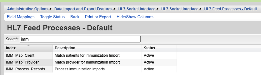 There are new indexes on the interface that activate the immunization imports. These indexes will be labeled “IMM_Map_Provider”, “IMM_Map_Client”, and “IMM_Process_Records. The “IMM_Map_Provider” index allows CAREWare to choose in which provider to look for the patient record where the data should go. The “IMM_Map_Client” index allows CAREWare to choose which CAREWare patient to link the data to. The “IMM_Process_Records” index processes all mappings to translate the incoming record to the patient record in CAREWare.